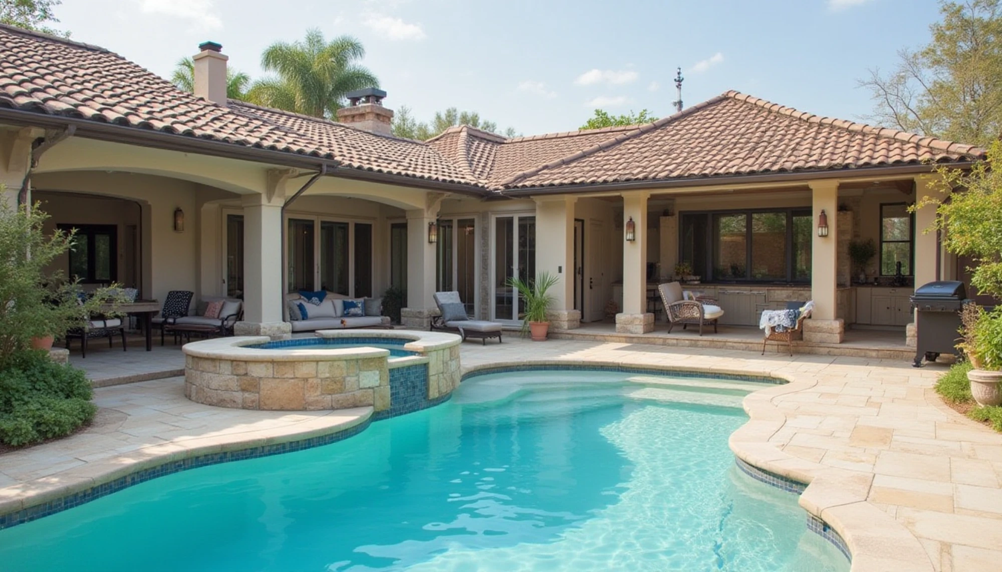 This lagoon-style freeform pool was built with natural rock, integrated waterfall, and lush landscaping to complete the resort-like look and feel of this pool.